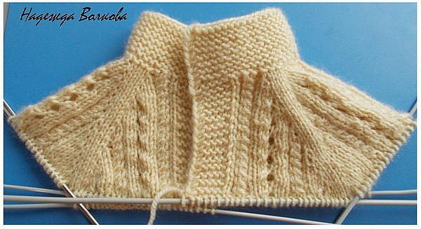 Так вязать далее, пока от проймы не будет связано 21 см. В изнаночном ряду убавить равномерно 6 петель и на оставшихся вязать манжету - 10 рядов платочной вязкой.