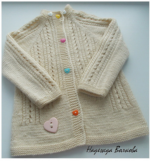 Провязав 23 см от проймы, закончить вязание 10 рядами платочной вязки. Сшить рукава. Пришить пуговки. Вот что должно получиться.