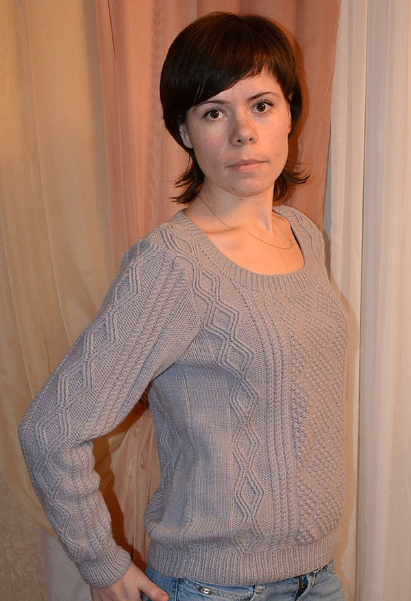 Пуловер связан из пряжи Пехорка "Элегантная" 100% меринос 250гр/100м, спицы №3,5 на резинку и №4,5 на основное полотно. Размер 36/38