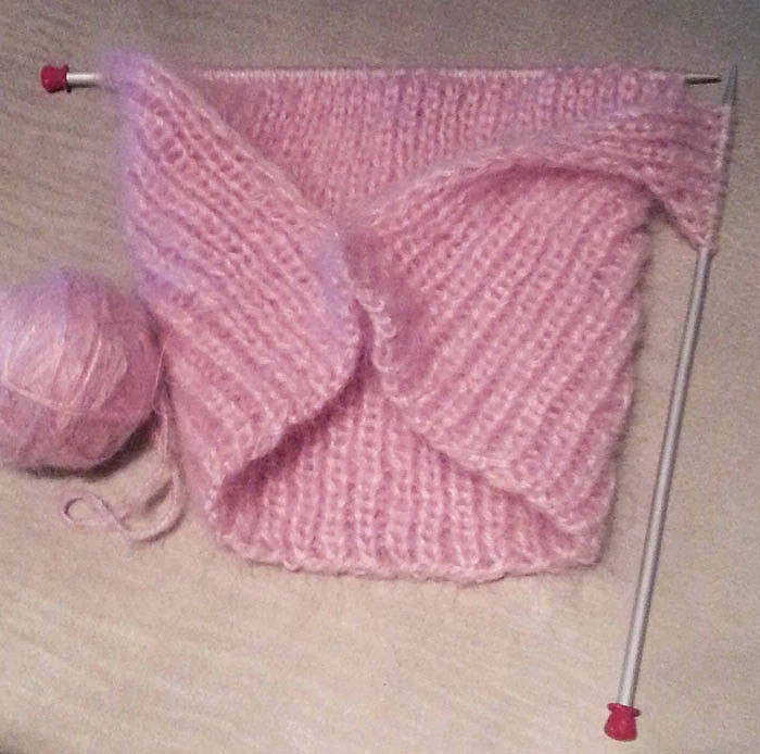 Для комплекта понадобится 200 грамм пряжи Mohair Classic торговой марки «Alise», розового цвета и прямые спицы № 7. Вязать в две нитки.