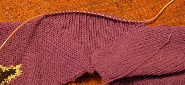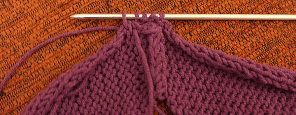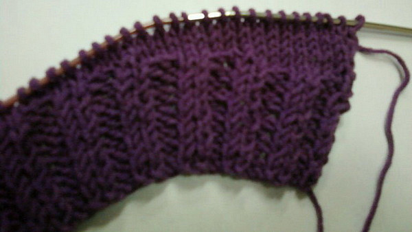 затем зацепить очередную кромочную петлю и провязать уже 5 петель в обратном направлении так далее пока в работе не окажутся все петли спинки и переда. Получилось 57 петель.