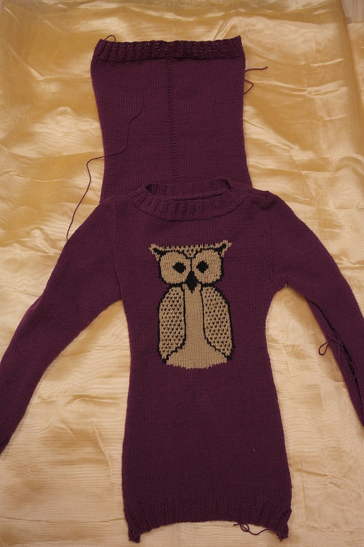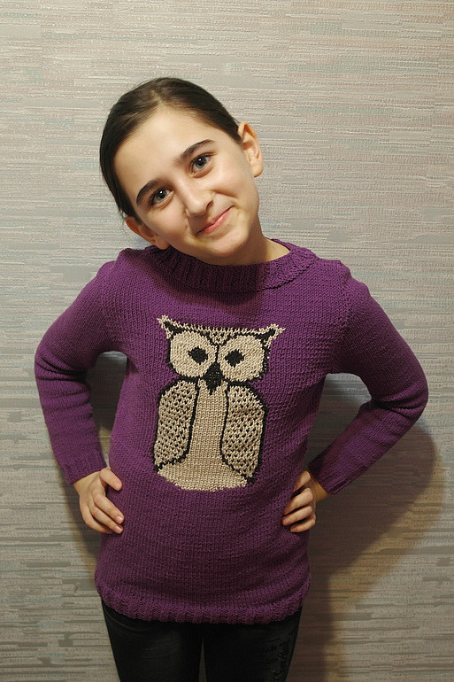 Свитерок с удлиненной спинкой связан из пряжа Джинс, спицы №3. Схему совы Ольга рисовала сама. На рост 134-140 см.